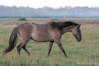 Lynne and Kevin welcomed my husband and I as if we had always been good friends. The greetings continued as the "pack" of dogs was released (only 4 I soon realized), various cats, and 2 geese which weren't quite as welcoming as we had obviously disrupted their feeding time. At last, there at the fence ready to have their morning feed and social time with their people, were the 4 distinct Grulla coloured horses, including Altamiro, the Sorraia stallion I had journeyed from Orillia to see. To add to this magical morning in the fields surrounding us a surreal table of fog was rising, moving fluidly in waves like a huge silk scarf blowing in the wind.